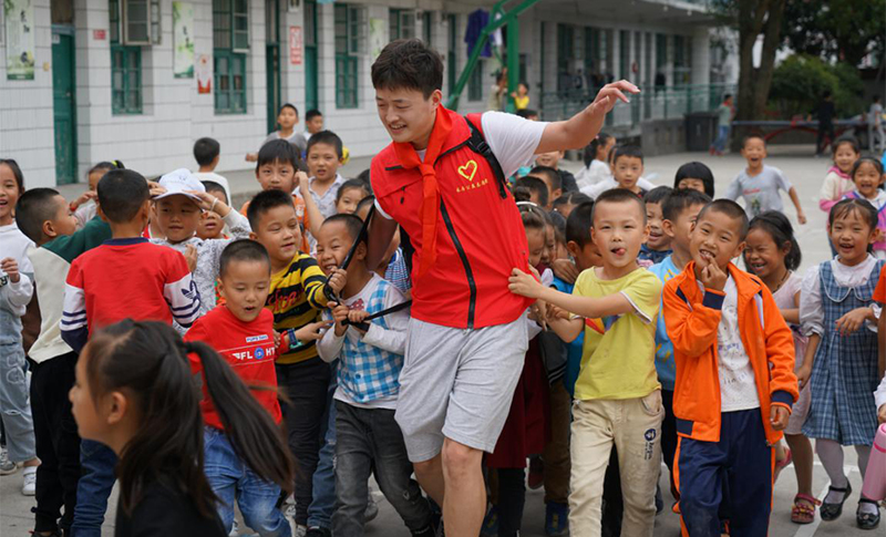 志愿者與孩子們玩“老鷹捉小雞”互動(dòng)游戲