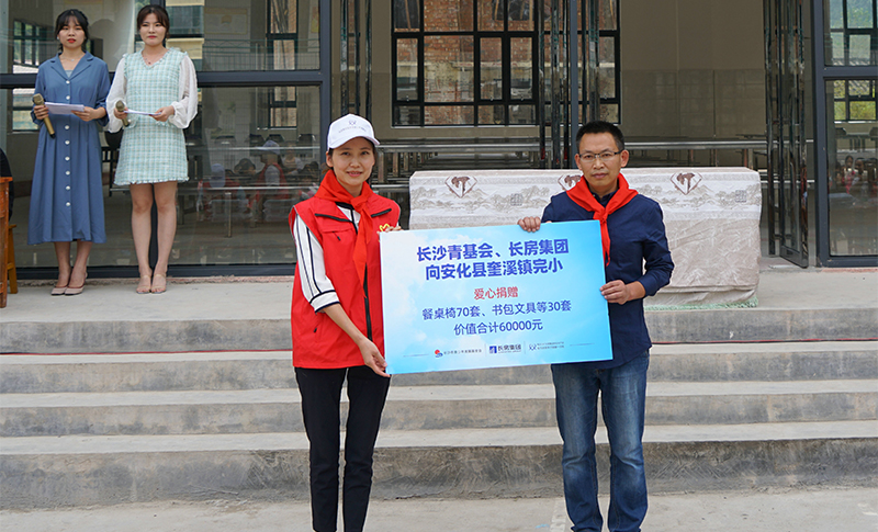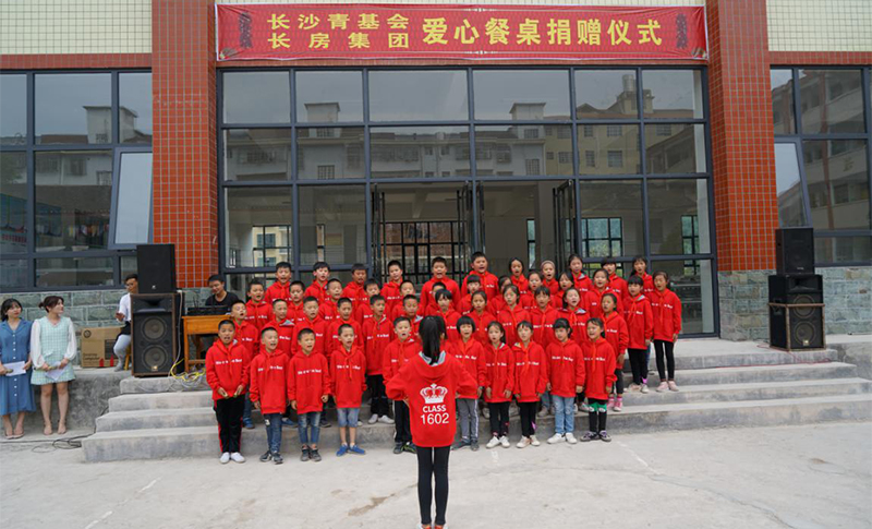 “金色的駝鈴,叮當(dāng)叮當(dāng),小駱駝帶著它走向遠(yuǎn)方,追趕著春天的腳步叮當(dāng),走向綠色的希望?!敝赡矍宕嗟母杪曉诎不h奎溪鎮(zhèn)完全小學(xué)校園里響起,融化著眾人的心。2019年9月25日,長(zhǎng)沙青基會(huì)與長(zhǎng)房集團(tuán)共同舉行的“大愛(ài)奎溪完小、情暖校園食堂”愛(ài)心餐桌椅捐贈(zèng)儀式在安化縣奎溪鎮(zhèn)完小舉行。儀式現(xiàn)場(chǎng),長(zhǎng)房集團(tuán)“藍(lán)絲帶”愛(ài)心傳遞基金向?qū)W校捐贈(zèng)了70套餐桌椅,并給學(xué)校30名貧困學(xué)生帶來(lái)了書包、文具等新學(xué)期禮物,本次愛(ài)心捐贈(zèng)價(jià)值60000元。長(zhǎng)房集團(tuán)黨群工作部負(fù)責(zé)人,長(zhǎng)沙市青少年發(fā)展基金會(huì)辦公室負(fù)責(zé)人,長(zhǎng)房集團(tuán)十余名青年志愿者,安化縣教育基金會(huì)、奎溪鎮(zhèn)政府、奎溪鎮(zhèn)中心學(xué)校的領(lǐng)導(dǎo)及奎溪鎮(zhèn)完小師生代表出席了捐贈(zèng)儀式。